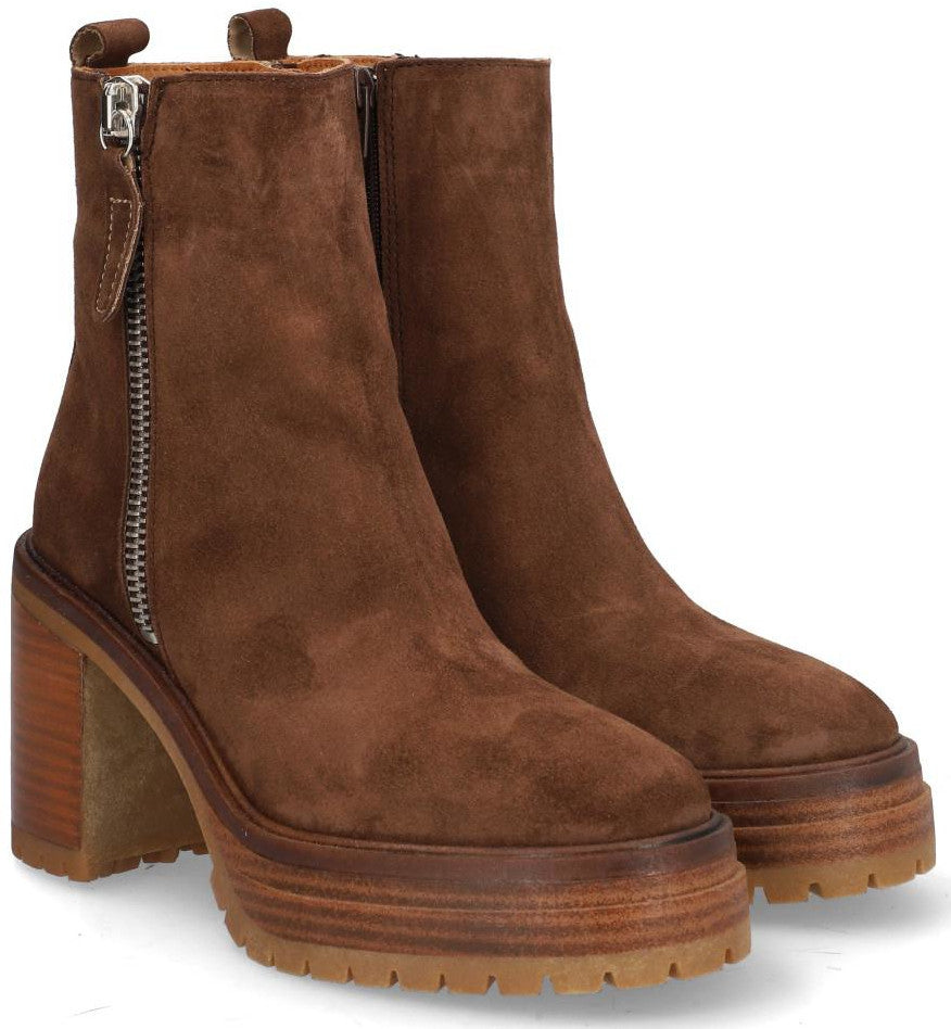 Botín para dama ALPE ANIMA hecho en piel ( baby silk) de color marrón con tacón de 8, 5 cm, suela antideslizante y puntera redonda, con cierre mediante cremallera y caña baja.