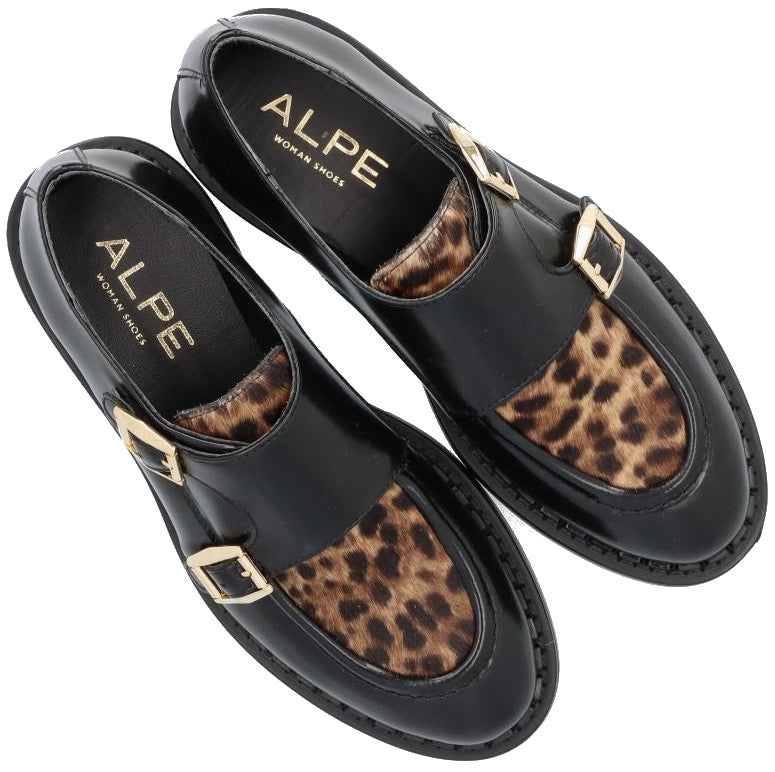Mocasines de mujer ALPE CHESTER en piel ( floppy + leopardo) de color negro con tacón de 3 cm, suela antideslizante y puntera redonda, cierre de hebilla.