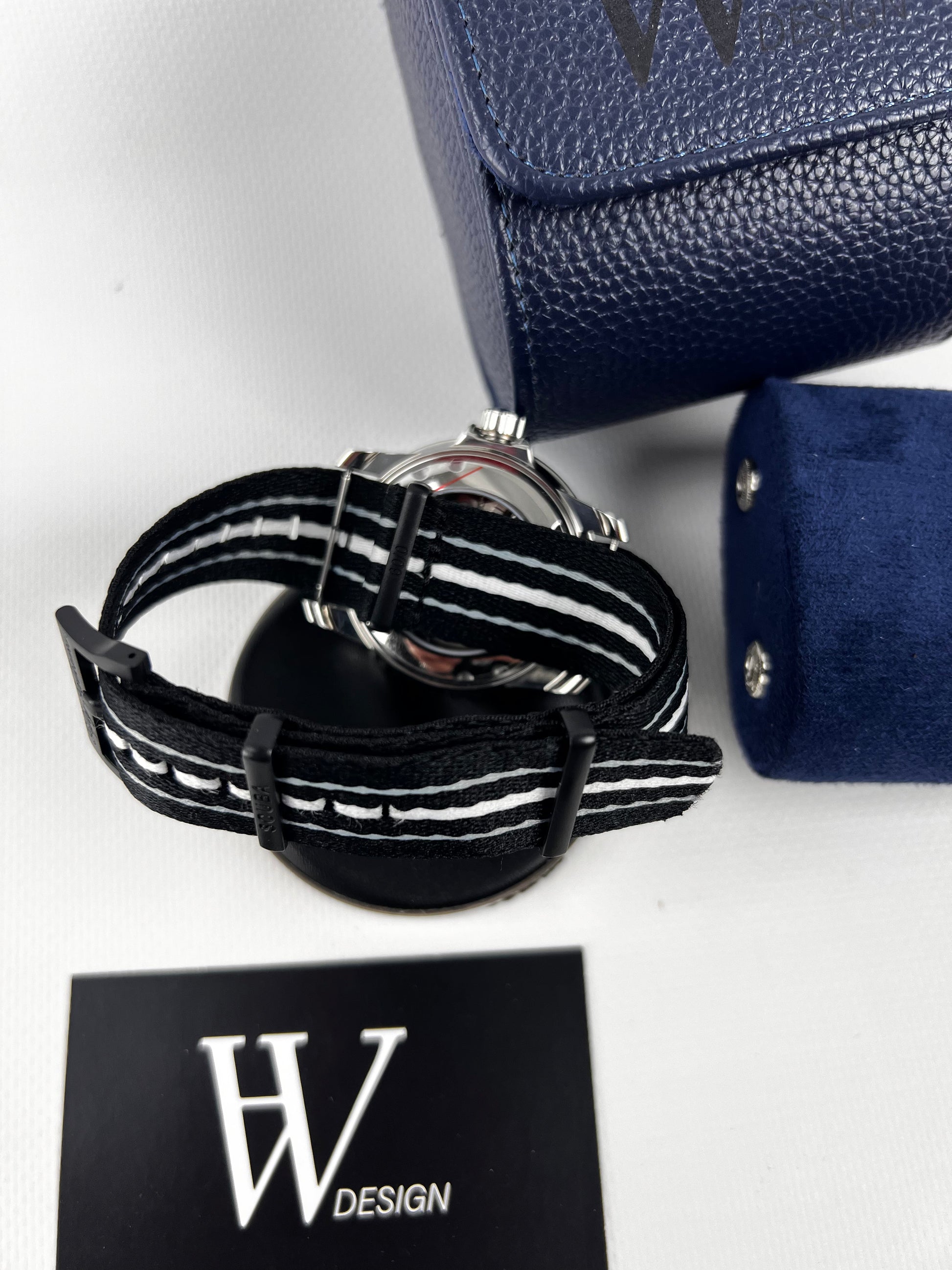 Basado en el Blancpain x Swatch Scuba Black, en HW presentamos su mejor versión, reemplazando la caja original de plástico por una caja y correa en acero inoxidable 904l y cristal de Zafiro.