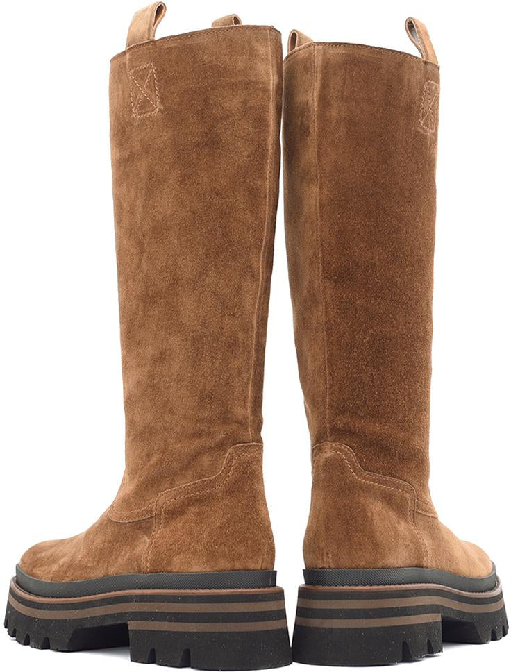 Botín para damas p_content fabricado en piel suave (baby silk) de tono marrón con plataforma de 5 cm, suela antideslizante y puntera redondeada, sin cierre y caña alta.