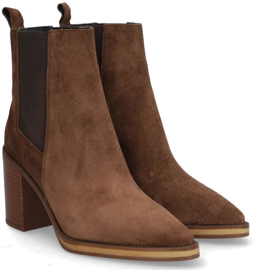 Sandalia para mujer ALPE CAMDEN fabricada en piel ( baby silk) de color marrón con tacón de 8 cm, suela antideslizante y puntera afilada, sin cierre y caña media.