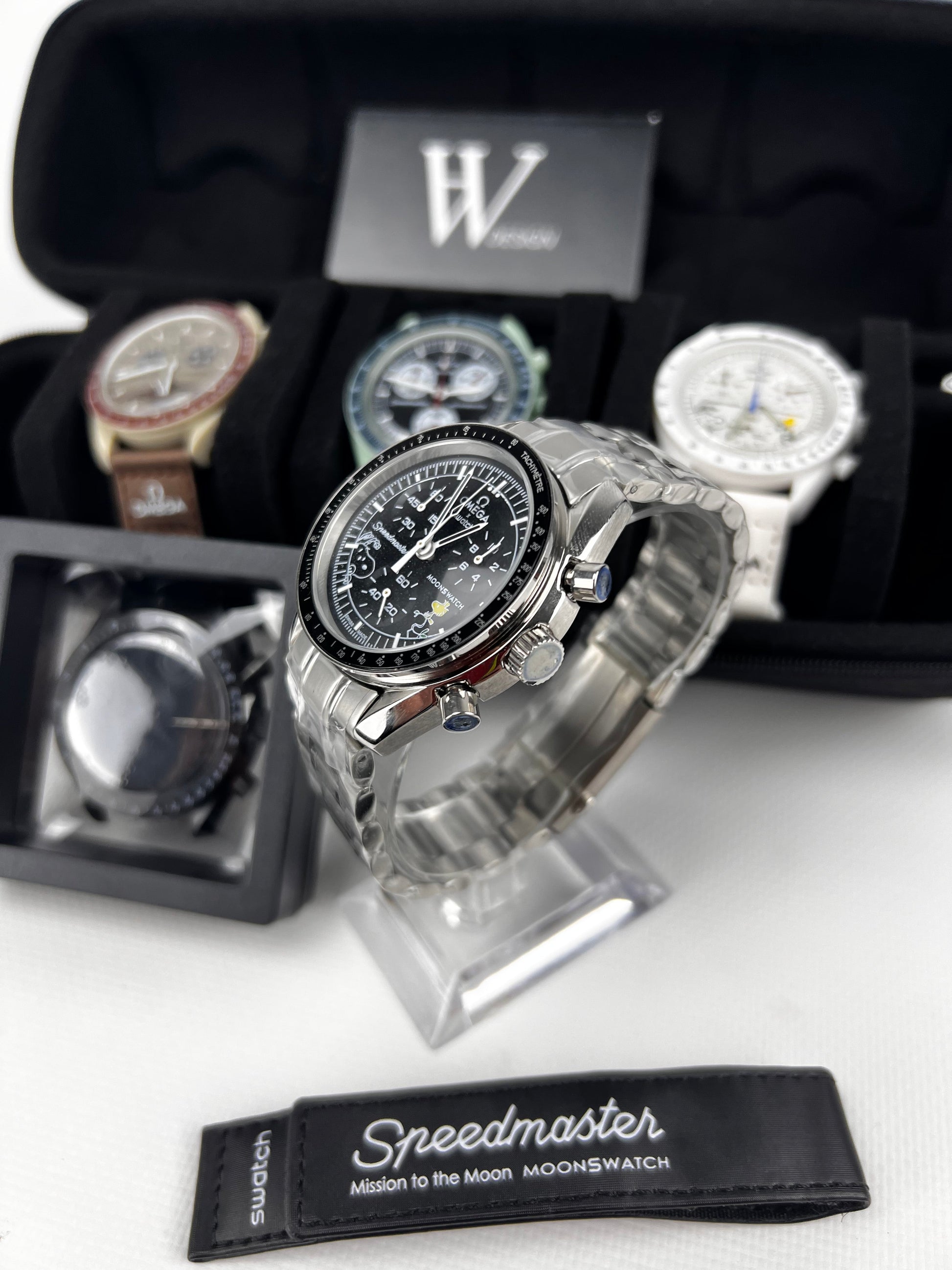 Basado en el Omega x Swatch Mission to Moon Black Snoopy, en HW presentamos su mejor versión, reemplazando la caja original de plástico por una caja y correa en acero inoxidable 316l y cristal de Zafiro.