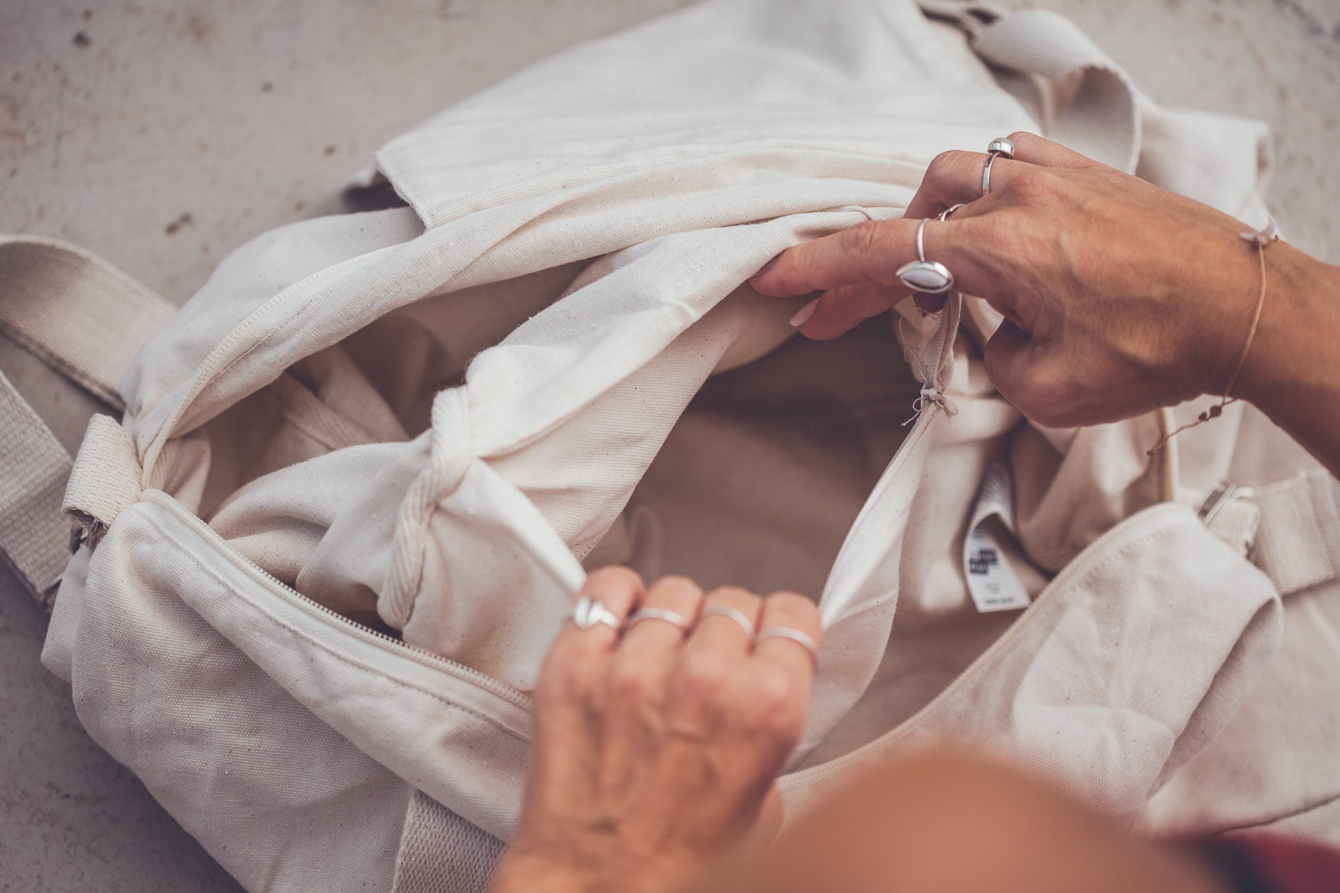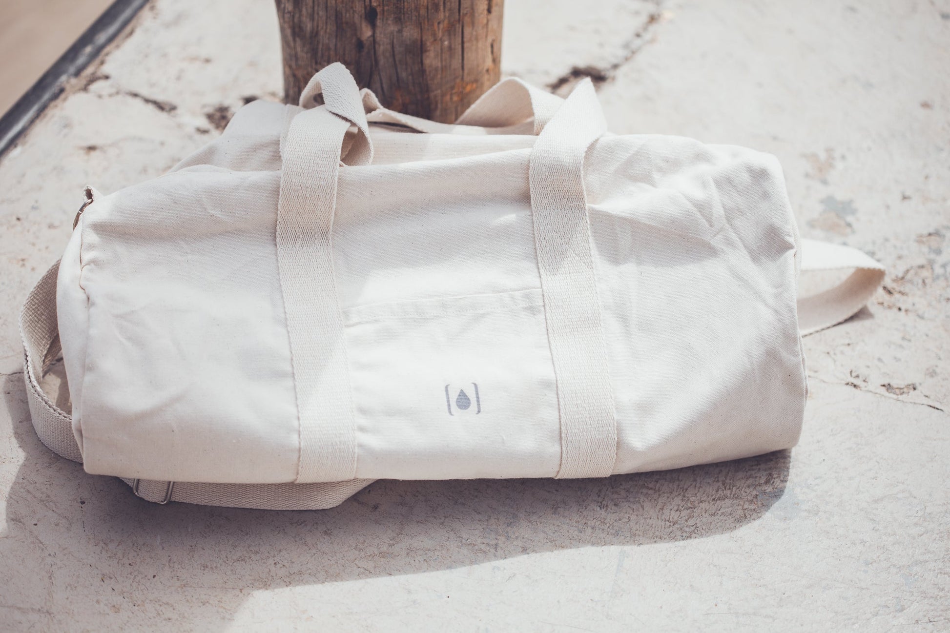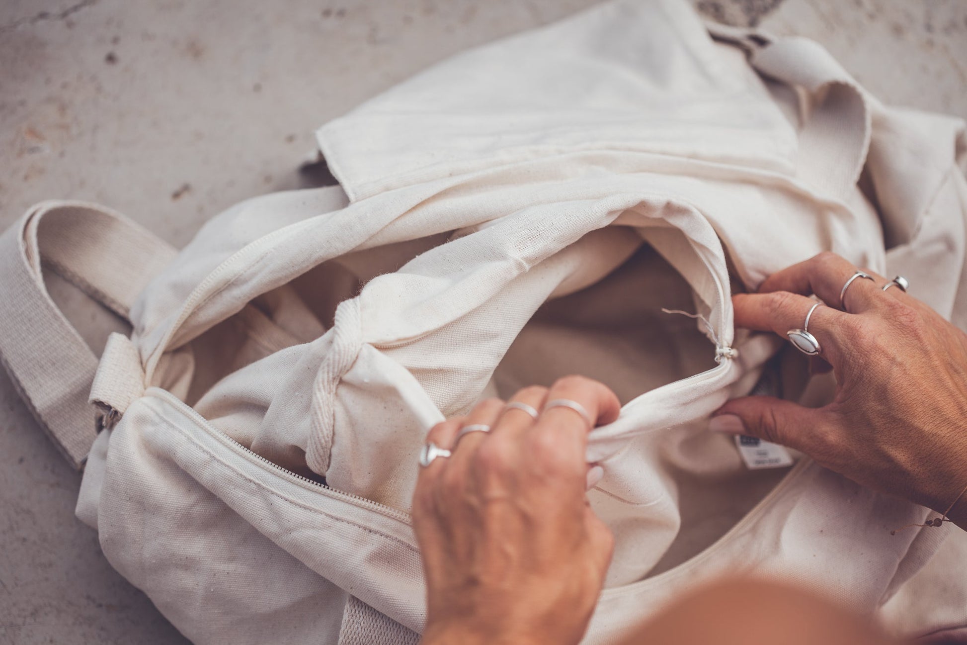 Unisex recycled canvas bag with zip, inside & outside pocket and carry straps.