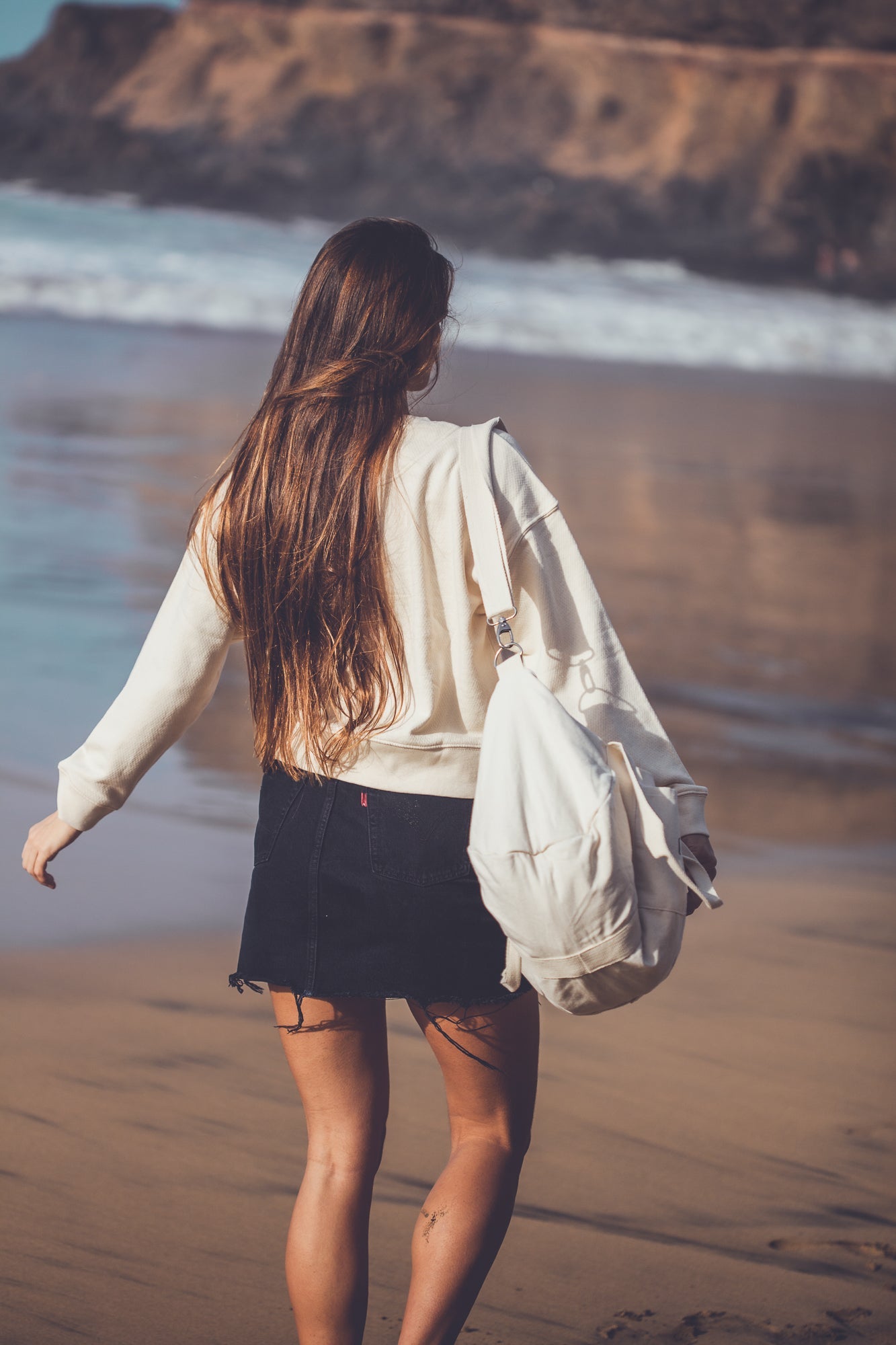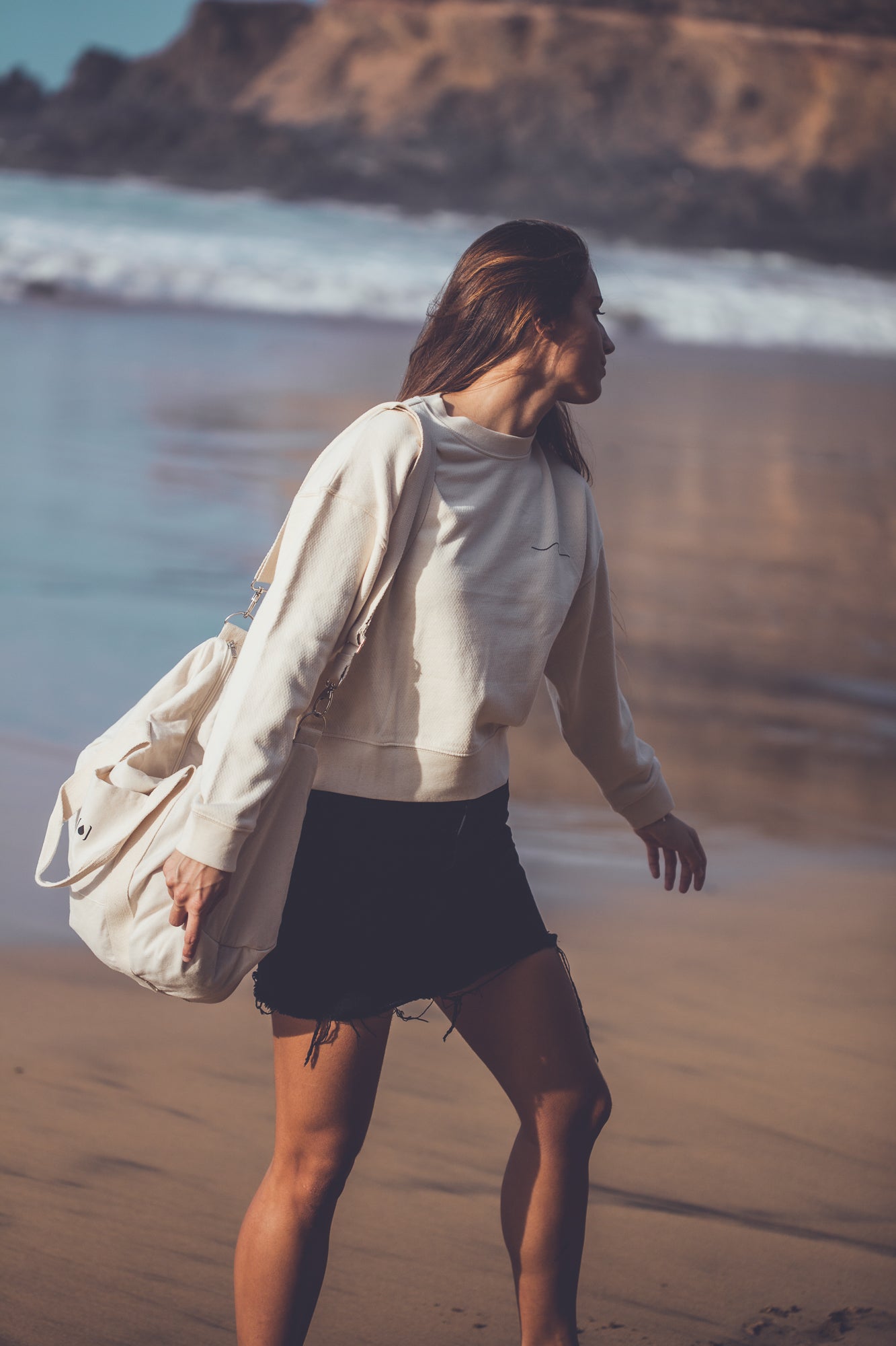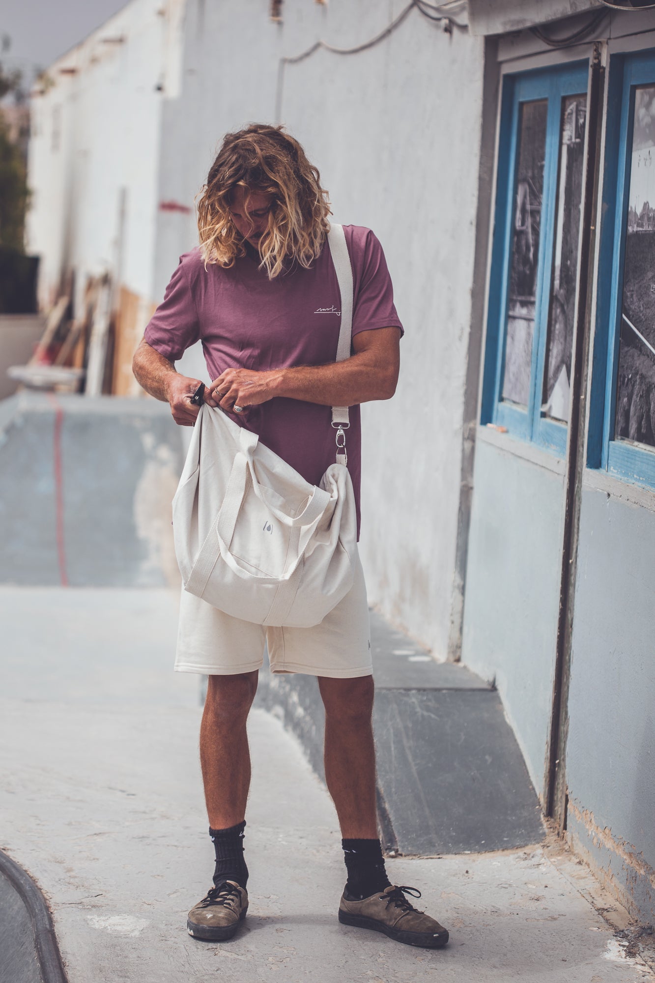 Unisex recycled canvas bag with zip, inside & outside pocket and carry straps.